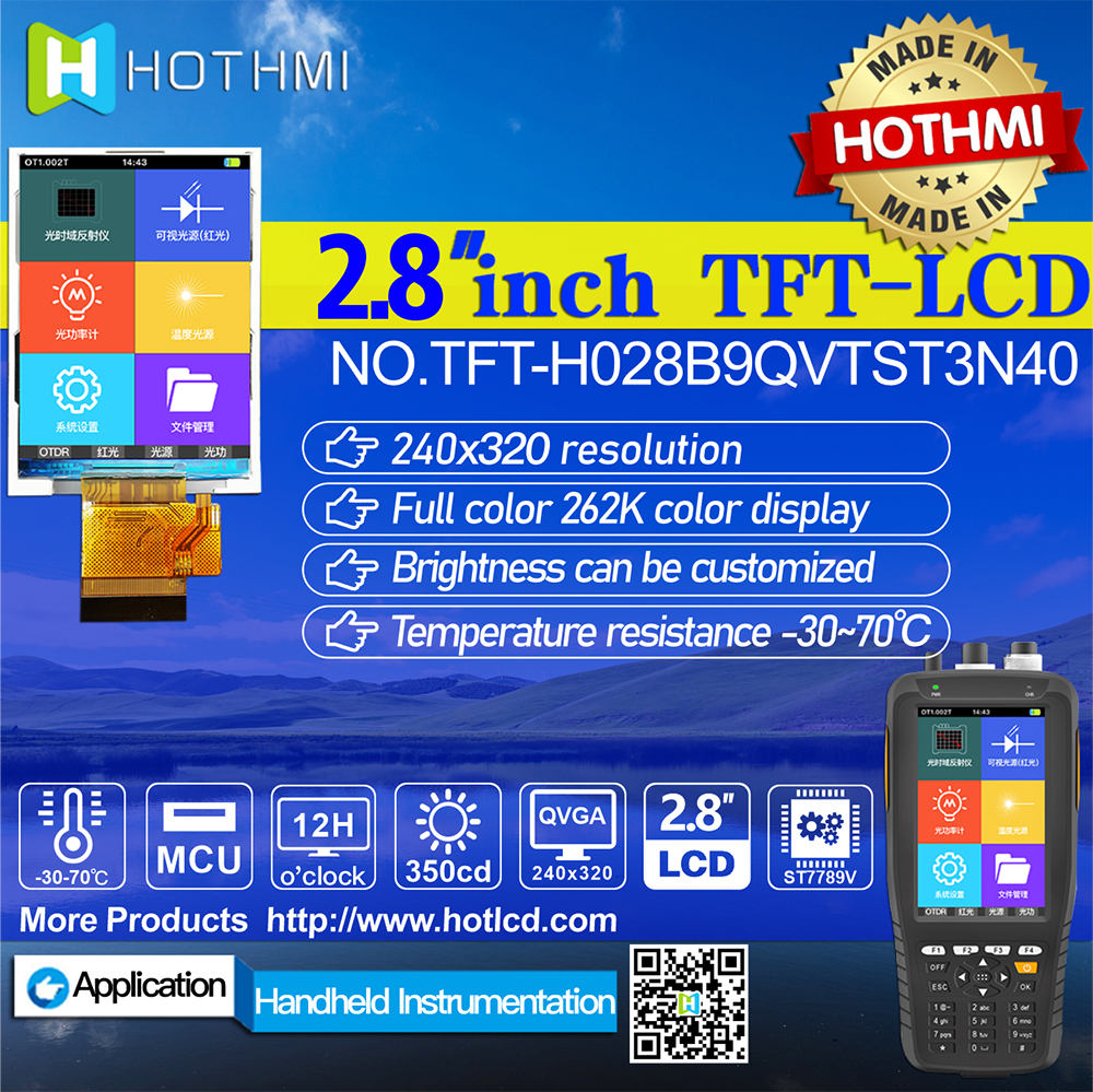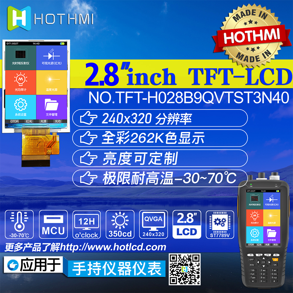 TFT-H028B9QVTST3N40是HOTLCD研發(fā)團隊精心設計的2.8英寸TFT彩色液晶屏,240*320分辨率,高畫質,廣視角,65K/262K真彩色,內置ST7789V控制器,支持MCU接口,40PIN外掛FPC可以接主板(可選接頭),單電源DC 2.8V供電。 TFT 模塊可配備觸摸屏,所有材料均符合 RoHS 標準。 廣泛應用于各種儀表、智能設備、分析儀器、手持儀表、行車記錄儀等:8051、PIC、AVR、ARDUINO、ARM、樹莓派等。