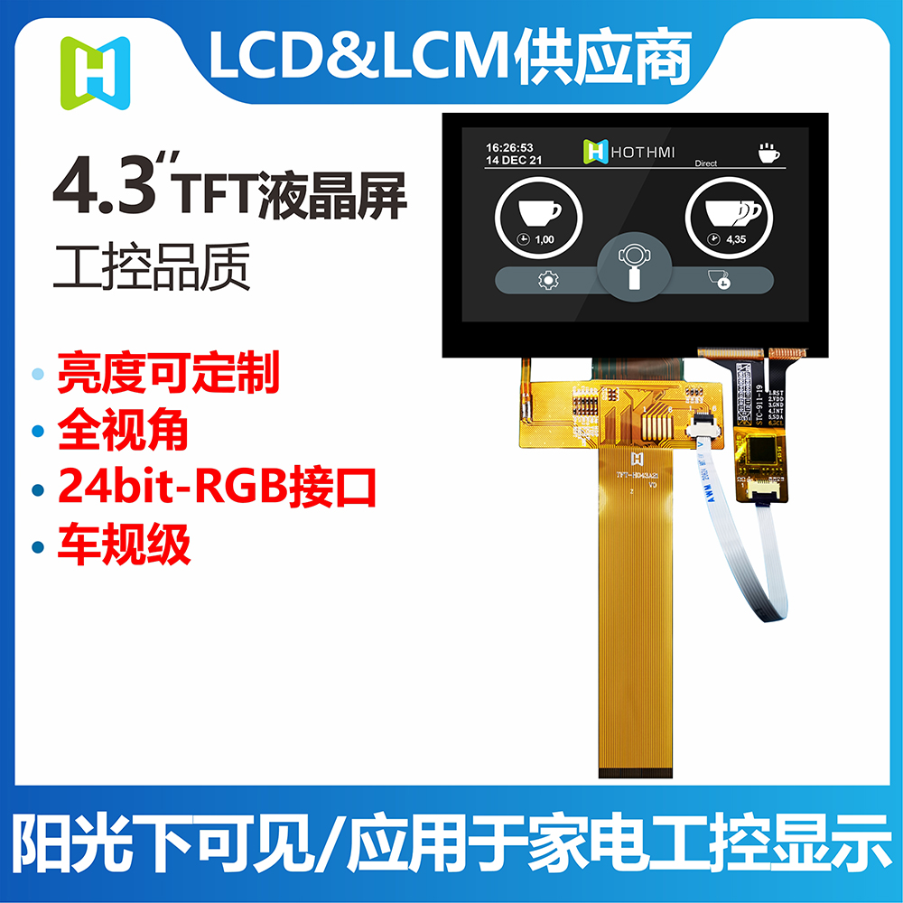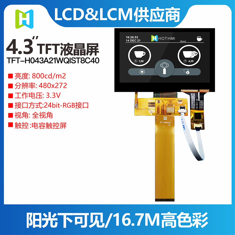 4.3寸TFT彩屏 /480*272分辨率 /全視角IPS工藝 /RGB 24Bit/IIC接口 /TFT-H043A21WQIST8C40/應(yīng)用于咖啡機,家電,工控,醫(yī)療顯示設(shè)備,陽光下可見