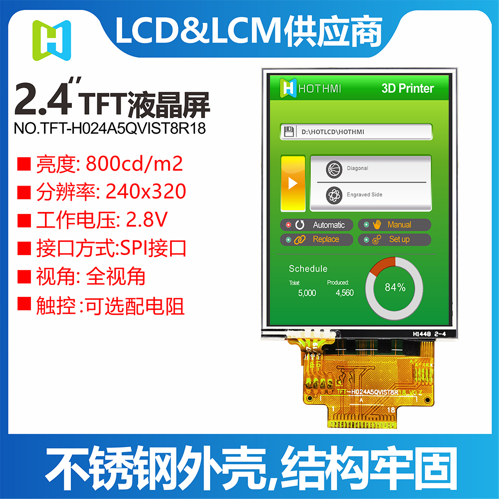 TFT-H024A5QVIST8R18是一款工業(yè)級(jí)豎屏顯示的 TFT LCD液晶屏,分辨率為240x320像素。使用ST7789V驅(qū)動(dòng)IC,自帶RTP電阻觸控屏??芍С諷PI-4L位兼容 SPI接口。液晶屏typical 亮度為800 nits,視角為全視角方向;供電電壓(VCI)為2.8V~3.3V,typical 值為2.8V。工作溫度為-20℃~+70℃,儲(chǔ)存溫度為-30℃~+80℃。