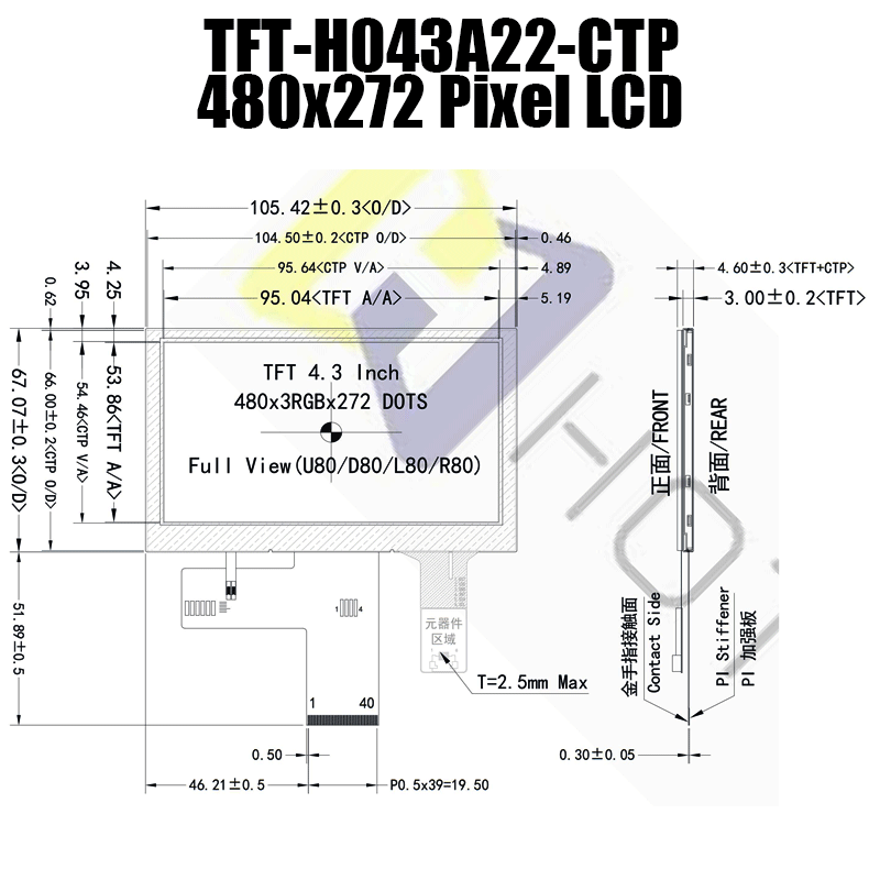 這款 480x272 陽光下可讀 TFT 配備了強大的背光,可在包括直射陽光在內的明亮照明條件下提供可視性。 具有SPI/MCU多接口和全視角的LCD顯示器。 這款 LCD 顯示器符合 RoHS 標準,具有 10 點多點觸控電容式觸摸屏。
