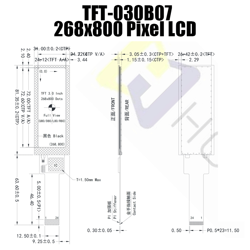 • 型號: 3.0英寸268x800 IPS電容式TFT液晶顯示屏寬溫/TFT-H030B07ZCIST8C24