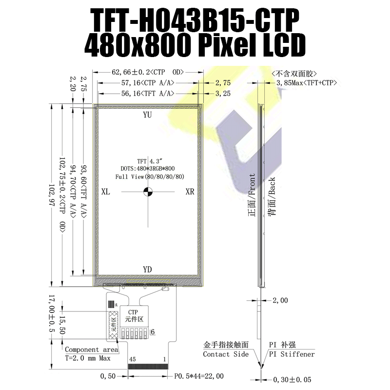 這是對(duì)具有電容式觸摸面板和 3:2 縱橫比的 TFT 顯示模塊的描述。 顯示屏尺寸為4.3英寸,分辨率為480×800像素。 它采用市場(chǎng)上流行的 IPS 面板,提供 80/80/80/80 度的寬視角。